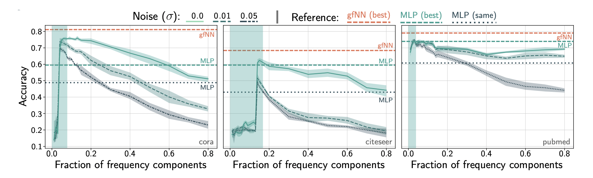 对结果有效(能提升节点分类效果)的都是低频滤波器。 验证:不断添加频率分量,重新构建特征,添加到一定比例时,效果开始下降。