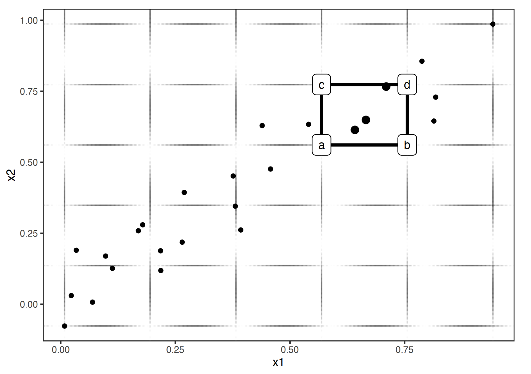 当描述两个特征时,ALE描述特征2在特征1的基础上,对预测值的影响,下图为例,用 $(f(d) - f(c)) - (f(b) - f(a))$ 作为特征 2 在特征 1 的基础上对预测值的影响。